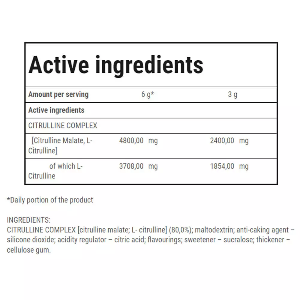 CITRULLINE SYNERGY contains citrulline malate and L-citrulline. CITRULLINE SYNERGY is designed for professional athletes. Recommended daily portion is 6 g (1 scoop).